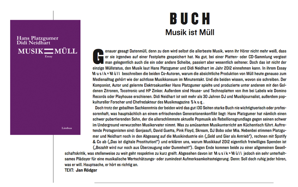 Ausgehend von einem Generationskonflikt analysieren die Co-Autoren ebenso versiert wie genussvoll die Müllhalden der Popmusik und den an seiner Digitalisierung gescheiterten Musikmarkt. Immer auf der Suche nach Auswegen und Hoffnungsschimmern begeben sie sich auf eine Reise voller Irrwege, Einbahnstrassen und Sackgassen und führen ihre Leser durch ein Dickicht von skrupellosen Geschäftsmodellen, gescheiterten Innovationen und abgründigen Liebschaften.